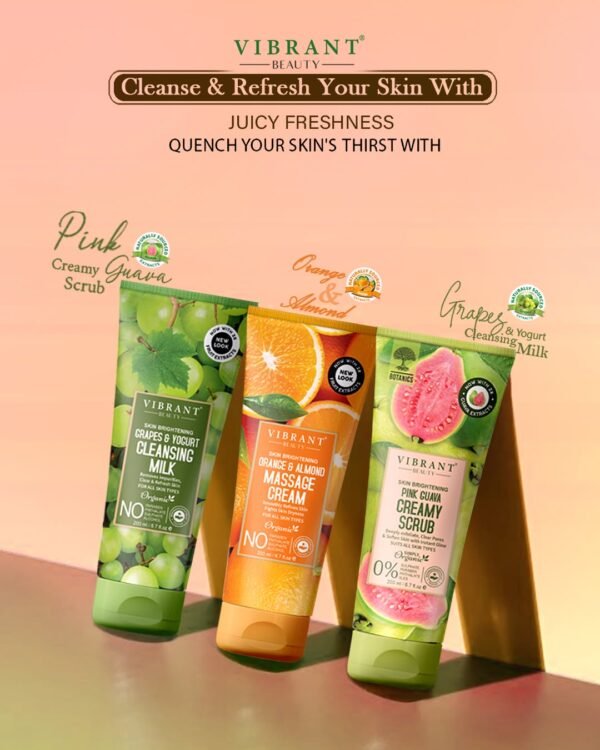 The box includes Grapes & Yogurt Cleansing Milk, Orange & Almond Massage Cream, and Pink Guava Creamy Scrub, making it a complete facial solution for healthy and vibrant skin.